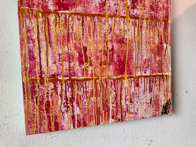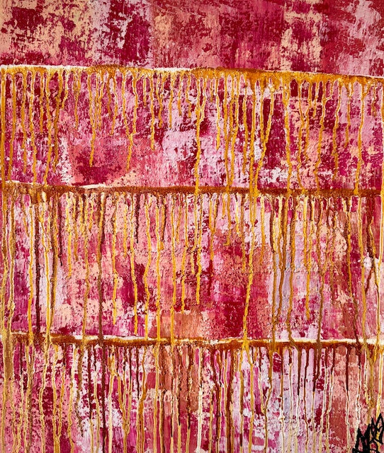 Layered rose, blush, and berry tones create a soft yet grounded foundation, while cascading gold drips symbolize the experiences that move through us — the battles, the breakthroughs, and the quiet transformations in between. Some moments leave their mark, but each one adds depth, wisdom, and resilience.