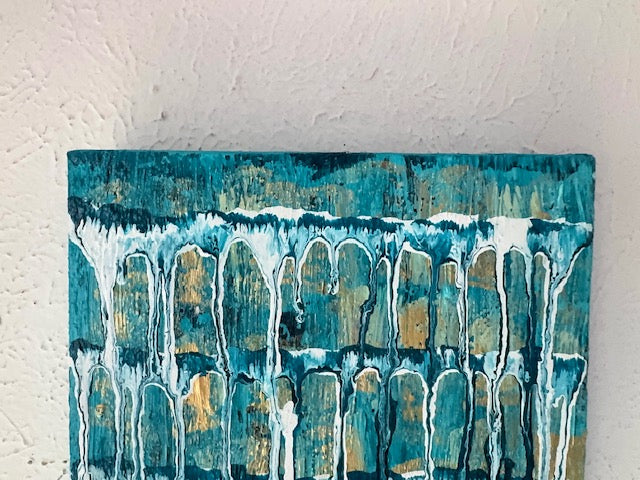 This original abstract painting shimmers with turquoise, deep blue, and golden layers that flow together like streams of light and movement. Infused with amethyst, rose quartz, citrine, and clear quartz, it radiates a balanced blend of protection, love, joy, and clarity.