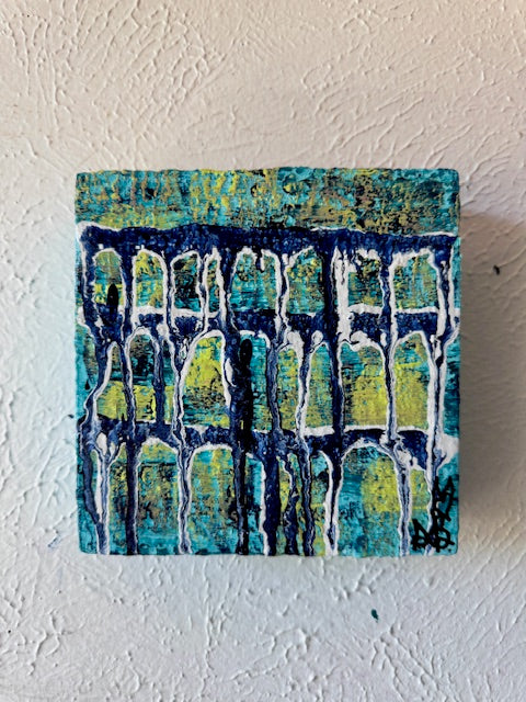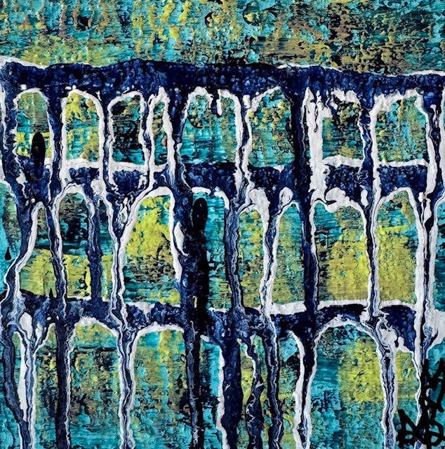 This small but powerful abstract painting glows with turquoise, navy, and bright green tones, accented by flowing white drips that create movement and depth. Infused with amethyst, it carries calming, protective energy that encourages clarity, peace, and spiritual strength.
