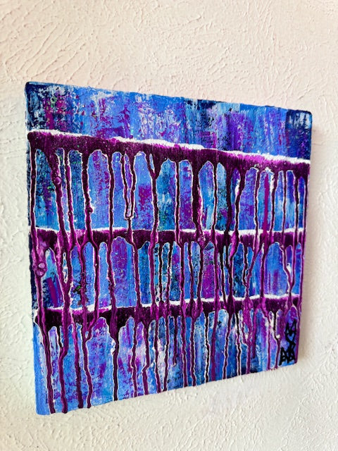 “Trusting The Process” captures the beauty of transformation through patience and faith. Infused with citrine, the crystal of clarity, abundance, and confidence, this piece embodies the gentle reminder to stay open as life unfolds. Vibrant layers of blue and violet are met with flowing magenta drips, representing growth, surrender, and the blossoming of inner light.
